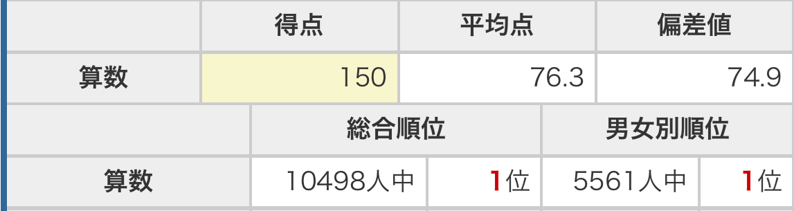 算数 150点/150点満点 平均点76.3点 偏差値74.9 1位/10,498人