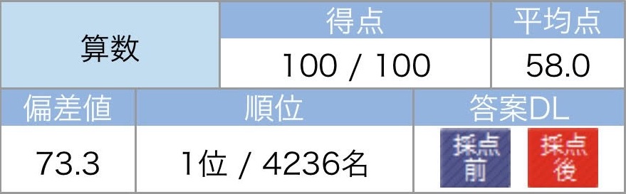算数 100点/100点満点 平均点58.0点 偏差値73.3 1位/4,236人