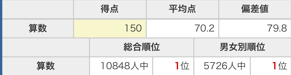 算数 150点/150点満点 平均点70.2点 偏差値79.8 1位/10,848人