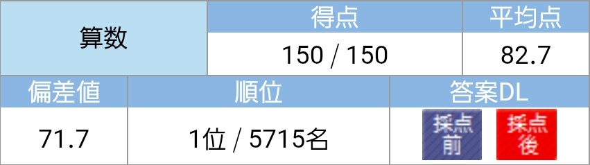 算数 150点/150点満点 平均点82.7点 偏差値71.7 1位/5,715人