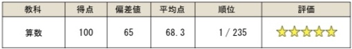 算数 100点/100点満点 偏差値65 平均点68.3点 1位/235人