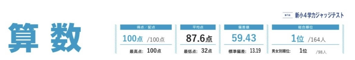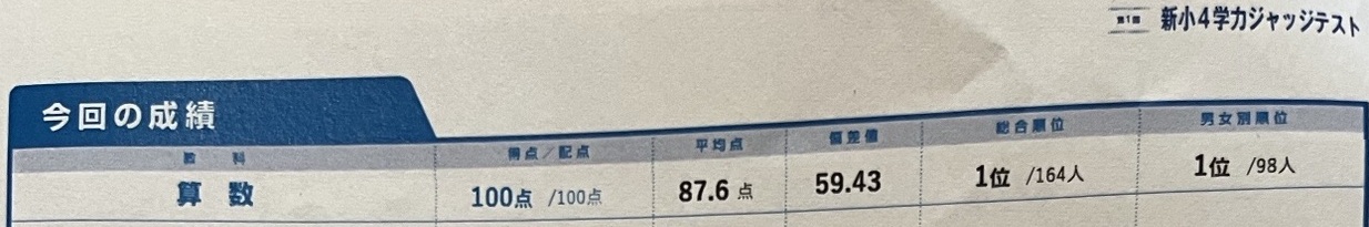 算数 100点/100点満点 平均点87.6点 偏差値59.43 1位/164人