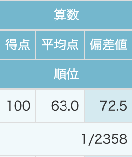 算数 100点/100点満点 平均点63.0点 偏差値72.5 1位/2,358人