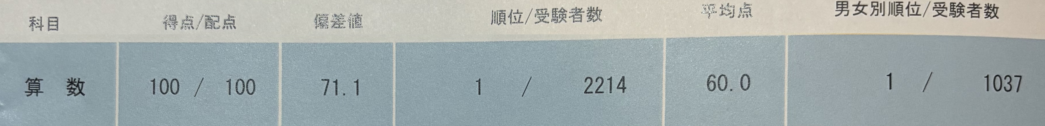 算数 100点/100点満点 偏差値71.1 1位/2,214人 平均点60.0点