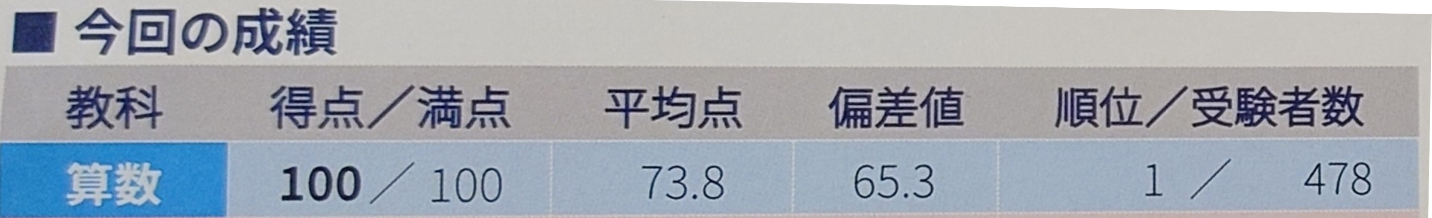 算数 100点/100点満点 平均点73.8点 偏差値65.3 1位/478人